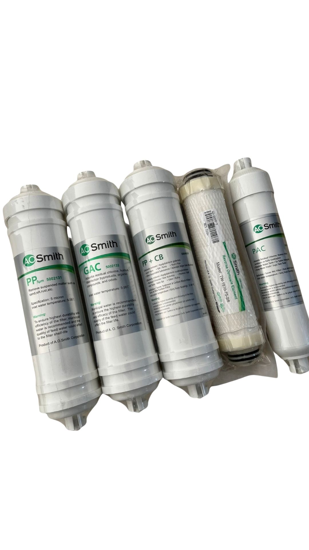 Aşama Filtre Adı Filtre Kodu / Tipi Görevi Teknik Özellik 1. Aşama PP Sediment Filtre PP 5 Mikron Fiziksel ön arıtma Tortu, kum, pas ve askıda katı maddelerin tutulmasına yardımcı olur 2. Aşama GAC Karbon Filtre GAC Klor ve organik giderim Klor, klor yan ürünleri, tat ve koku oluşumunun azaltılmasını destekler 3. Aşama PP + CB Karbon Filtre PP + Carbon Block İnce karbon arıtma Daha ince partiküller ve klor kalıntılarının azaltılmasına yardımcı olur 4. Aşama RO Membran Filtre Reverse Osmosis Membran Ters ozmoz arıtma Suda çözünmüş istenmeyen maddelerin büyük oranda ayrıştırılmasına destek sağlar 5. Aşama PAC Post Karbon Filtre PAC Tat düzenleme Arıtılmış suya dengeli ve yumuşak içim kazandırır Bu filtre seti, görselde yer alan A.O. Smith Daisy inline sistemlerle birebir uyumludur.